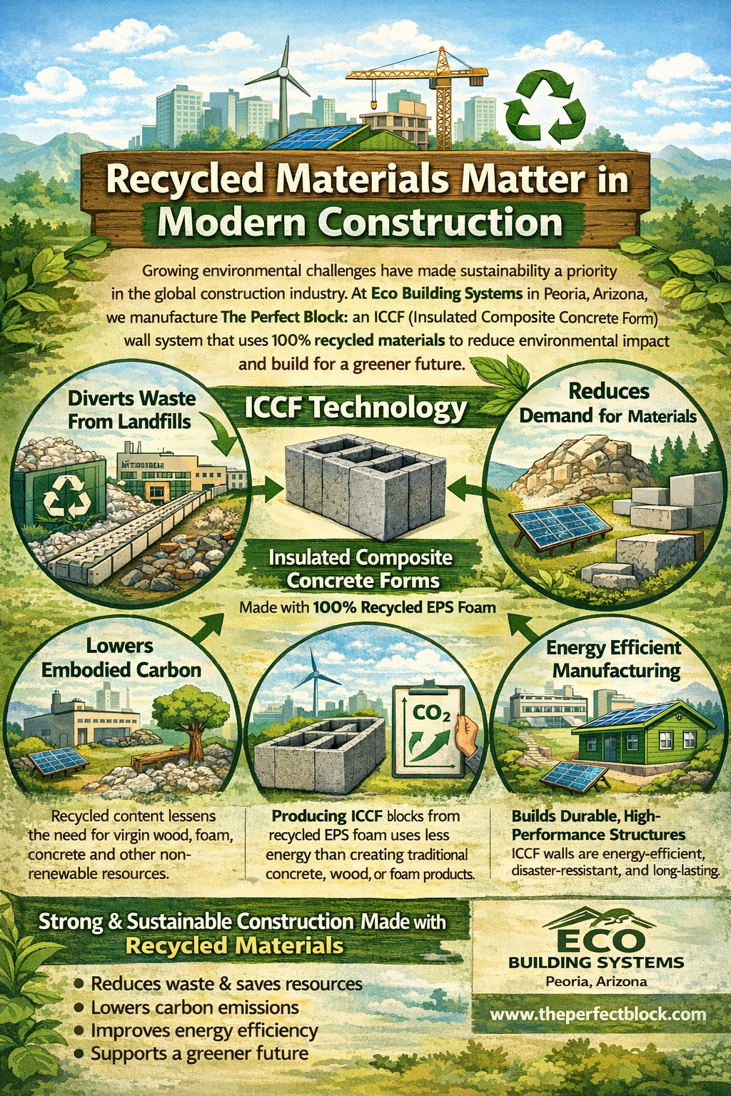 At Eco Building Systems in Peoria, Arizona, our commitment to sustainability is central to how we manufacture The Perfect Block, an ICCF (Insulated Composite Concrete Form) wall system made using recycled materials. This approach not only reduces waste but also contributes to long-term environmental benefits that affect communities worldwide.